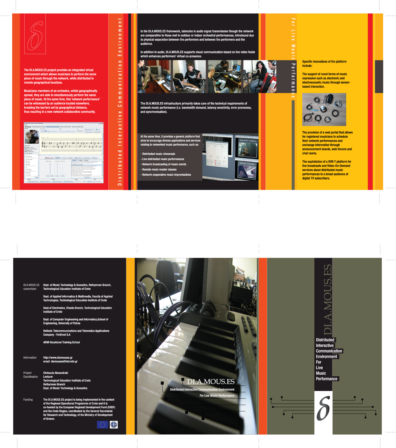 κατά τη ζωντανή ΜΟΥΣική ΕκτέλεΣη υλοποιείται στα πλαίσια του: ΕΠΙΧΕΙΡΗΣΙΑΚΟΥ ΠΡΟΓΡΑΜΜΑΤΟΣ ΚΡΗΤΗΣ 2000-2006 ΜΕΤΡΟ 1.2 «Κοινοπραξίες Έρευνας και Τεχνολογικής Ανάπτυξης σε τομείς Εθνικής Προτεραιότητας» Θεματικός Τομέας 7.2 Πολιτισμός-Τουρισμός Έντασης Γνώσης, Σύγχρονος Πολιτισμός Το ΔΙΑΜΟΥΣΕΣ συγχρηματοδοτείται από το Ευρωπαϊκό Ταμείο Περιφεριακής Ανάπτυξης (ΕΤΠΑ) και την Περιφέρεια Κρήτης με τελικό δικαιούχο τη Γενική Γραμματεία Έρευνας και Τεχνολογίας. Project DI.A.MOUS.ES - Distributed InterActive communication environment for live MUSic performancE(S) is implemented in the context of REGIONAL OPERATIONAL PROGRAM OF CRETE 2000-2006 "Constortiums of Research and Technological Development in Areas of National Priority" Thematic Area 7.2: Culture - Tourism, Contemporary Culture The project is co-funded by the European Regional Development Fund (ERDF) and the Crete Region , coordinated by the General Secretariat for Research and Technology. |