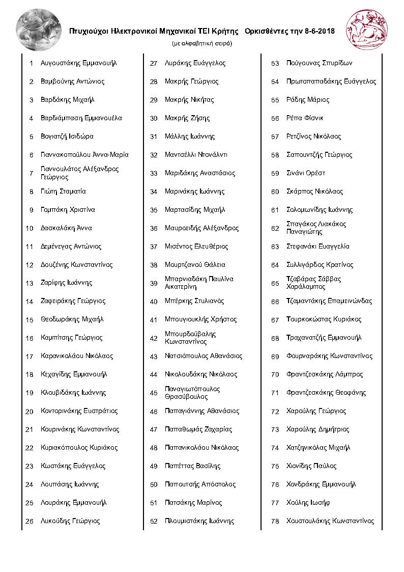 Τα ονόματα των 78 νέων πτυχιούχων Ηλεκτρονικών Μηχανικών, που παίρνουν το πτυχίο τους κατά την Τελετή Απονομής της Παρασκευής 8-6-2018