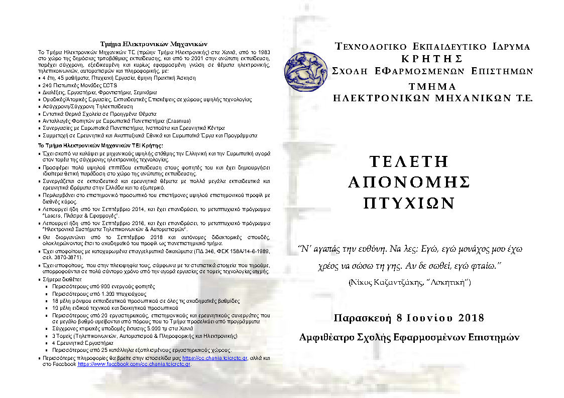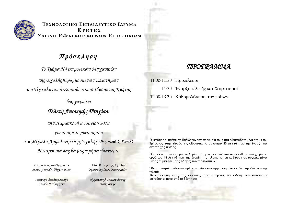 Την Παρασκευή 8 Ιουνίου 2018 θα πραγματοποιηθεί η επόμενη τελετή απονομής πτυχίων του Τμήματος Ηλεκτρονικών Μηχανικών, στο αμφιθέατρο της Σχολής Εφαρμοσμένων Επιστημών.