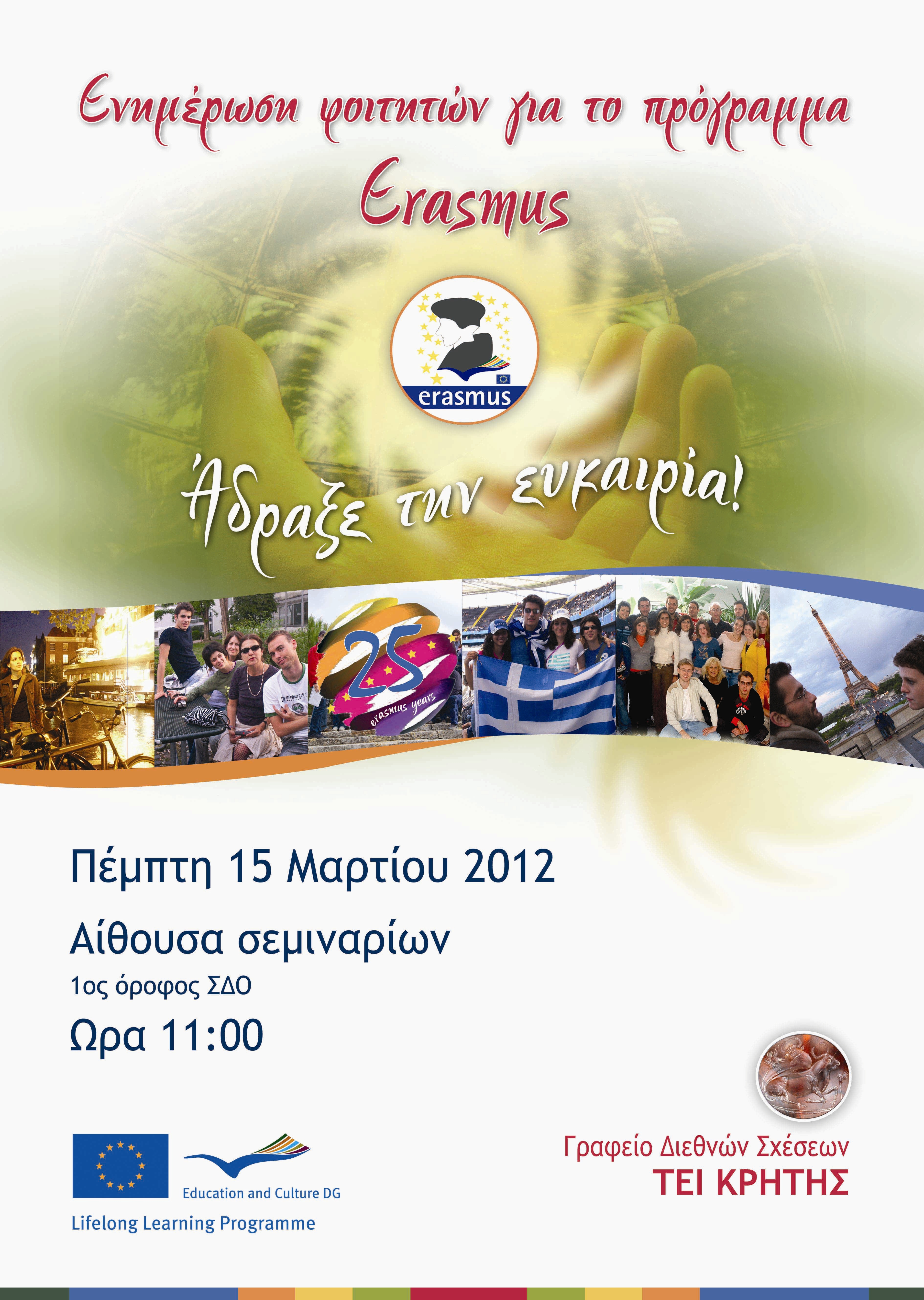 Ενημέρωση φοιτητών για το πρόγραμμα ERASMUS την Πέμπτη 15 Μαρτίου 2012 Ημερομηνία: 13/03/2012 Συνημμένο: enhmwrwsh_foithtwn_programma_ERASMUS_20120315.JPG