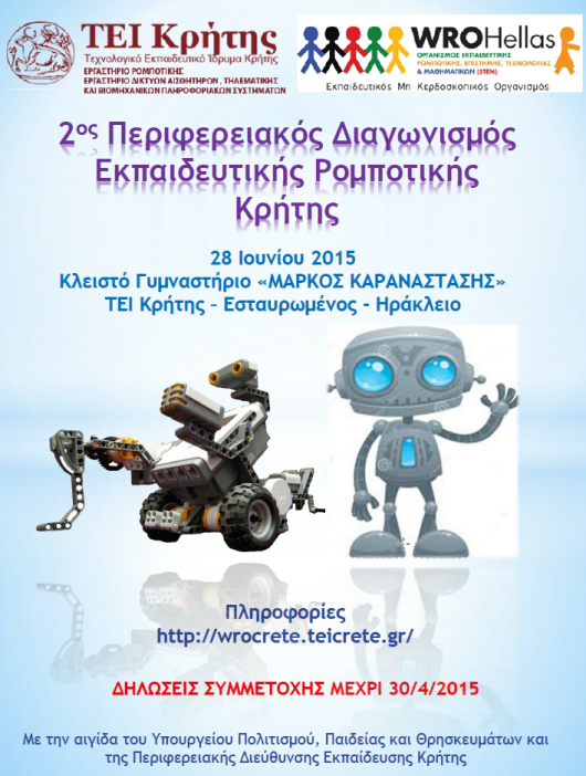 Ο 2ος Παγκρήτιος Διαγωνισμός Εκπαιδευτικής Ρομποτικής αποτελεί τον προκριματικό για τις ομάδες από την Κρήτη που επιθυμούν να συμμετάσχουν στον Πανελλήνιο διαγωνισμό, με τελικό προορισμό την Ολυμπιάδα Ρομποτικής 2015 στη Ντόχα του Κατάρ από 6 έως 8 Νοεμβρίου. Ο Παγκρήτιος Διαγωνισμός διοργανώνεται από τα Εργαστήρια Ρομποτικής και Δικτύων Αισθητήρων - Τηλεματικής - Βιομηχανικών Πληροφοριακών Συστημάτων της Σχολής Τεχνολογικών Εφαρμογών του ΤΕΙ Κρήτης και τον WROHellas και θα διεξαχθεί την Κυριακή 28 Ιουνίου 2015 στο Κλειστό Γυμναστήριο του ΤΕΙ Κρήτης στο Ηράκλειο.