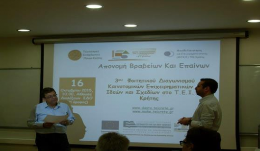 Με επιτυχία πραγματοποιήθηκε η απονομή των βραβείων και επαίνων του 3ου φοιτητικού διαγωνισμού καινοτομικών ιδεών και επιχειρηματικών σχεδίων την Παρασκευή 16.10.2015 στην αίθουσα σεμιναρίων της ΣΔΟ/ΤΕΙ Κρήτης. Η καθιέρωση των φοιτητικών διαγωνισμών αυτού του είδους αποτελεί κοινή πρωτοβουλία της Μονάδας Καινοτομίας και Επιχειρηματικότητας (ΜΟΚΕ), καθώς και της Δομής Απασχόλησης και Σταδιοδρομίας (ΔΑΣΤΑ) του ΤΕΙ Κρήτης, μόλις τα τελευταία χρόνια. Βασικός σκοπός αυτής της δράσης είναι η ενθάρρυνση και η εμπέδωση στους φοιτητές του Ιδρύματος πνεύματος και κουλτούρας καινοτόμου επιχειρηματικότητας.