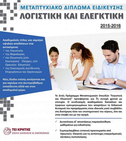 «Το Τ.Ε.Ι. ΚΡΗΤΗΣ προσκαλεί πτυχιούχους Α.Ε.Ι. (Πανεπιστημίων, Πολυτεχνείων ή Τ.Ε.Ι.) να υποβάλλουν αίτηση υποψηφιότητας για το καταξιωμένο ακαδημαϊκά και επαγγελματικά ΠΜΣ Λογιστική και Ελεγκτική (ΠΜΣ-ΛΕ), του Τμήματος Λογιστικής και Χρηματοοικονομικής, της Σχολής Διοίκησης και Οικονομίας (Σ.Δ.Ο.).