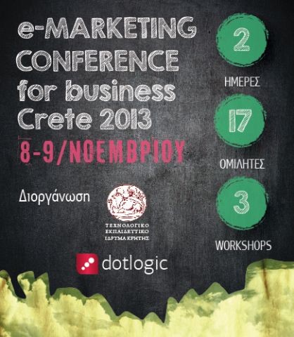 Το ΤΕΙ Κρήτης και η dotlogic διοργανώνουν το 1ο Συνέδριο Ηλεκτρονικού Μάρκετινγκ, που πραγματοποιείται στην Κρήτη. Το συνέδριο τελείται υπό την αιγίδα της Περιφέρειας Κρήτης και της Ελληνικής Ακαδημίας Μάρκετινγκ.