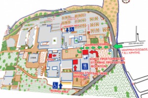 Αναλυτικός χάρτης των κτιριακών εγκαταστάσεων του ΤΕΙ Κρήτης στο Ηράκλειο με σημείωση των σχολών καθώς και του χώρου που θα πραγματοποιηθούν οι προεγγραφές.