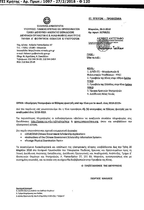 27/2/2018 ΧΟΡΗΓΗΣΗ ΥΠΟΤΡΟΦΙΩΝ ΣΕ ΕΛΛΗΝΕΣ ΦΟΙΤΗΤΕΣ ΑΠΟ ΤΗΝ ΚΙΝΑ ΑΚ.ΕΤΟΥΣ 2018-19